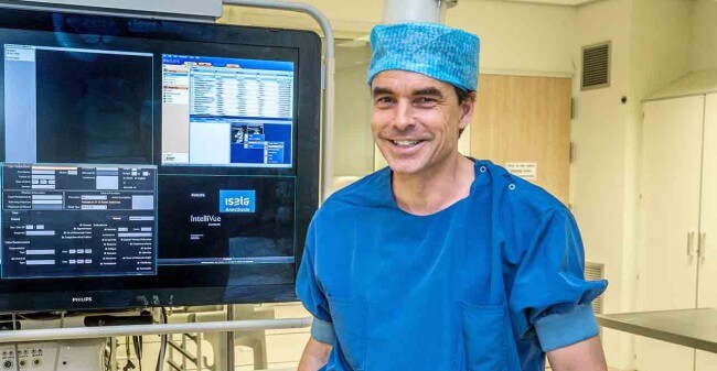 Cardioloog Vincent Roolvink: ‘Per jaar dotteren wij 2.000 patiënten. Dat zijn spoedpatiënten (hartinfarcten) of patiënten die bijvoorbeeld inspanningsgebonden pijn op de borst hebben door hartklachten. Dotteren kan dan een manier zijn om de pijn te verlichten. Tijdens het dotteren breng ik via de pols of lies een katheter naar het hart. Met een draadje (wire) als geleider in de kransslagader, plaats ik vervolgens een ballonnetje met een stent om de vernauwing of verstopping op te heffen. Hierdoor rekt de ader en kan het bloed weer goed doorstromen. Wanneer iemand een vernauwde kransslagader (aderverkalking) heeft, dan hoeft hij dit niet meteen te merken. Vaak verschijnen er pas symptomen als de vernauwing meer dan de helft van het bloedvat blokkeert. Tijdens inspanning is de kans groter dat er symptomen ontstaan, want op dat moment moet het hart meer bloed rondpompen.’ Afhankelijk van de situatie is een dotterbehandeling geen belastende ingreep. De meeste patiënten kunnen zelfs dezelfde dag weer naar huis.’